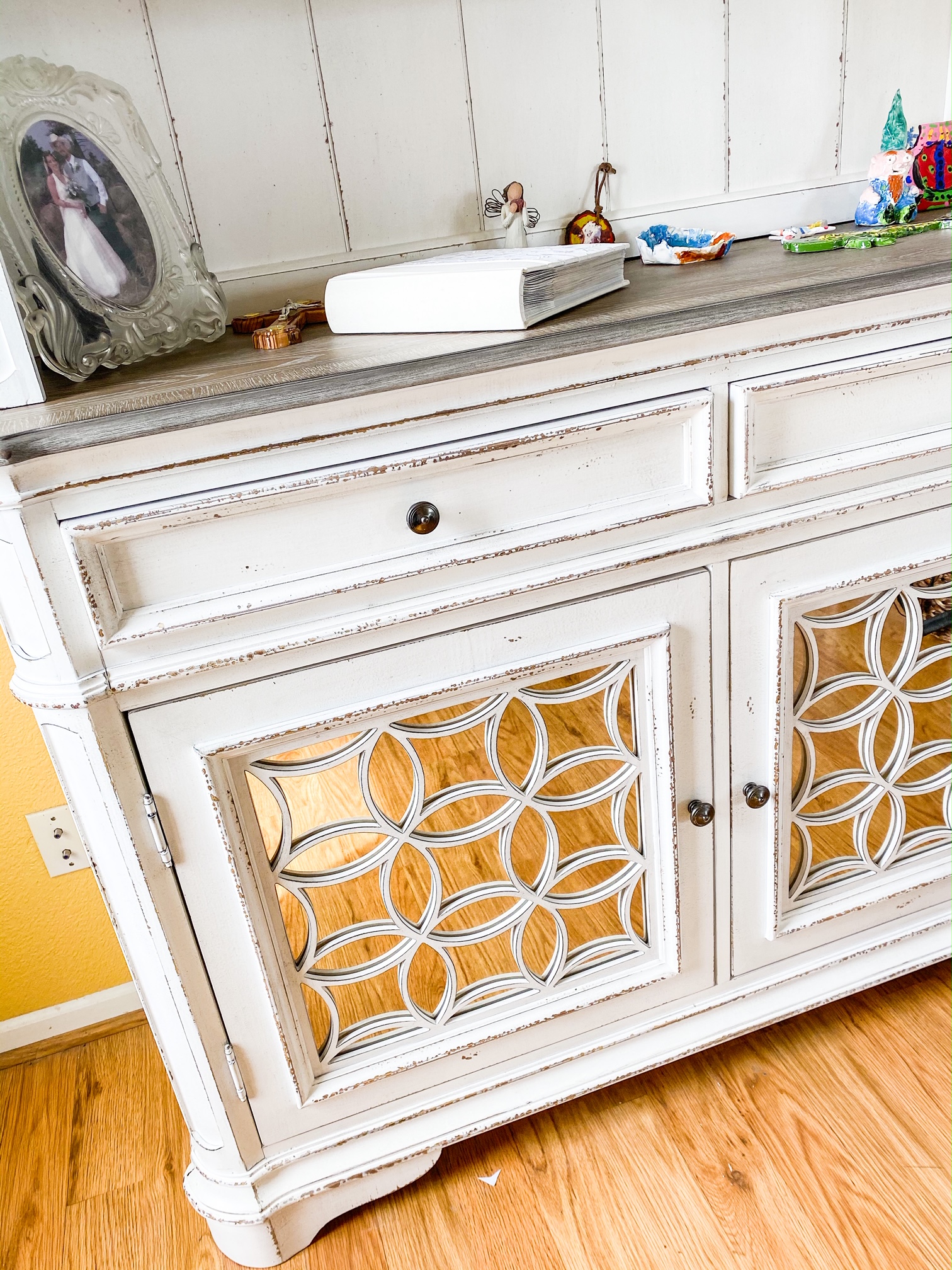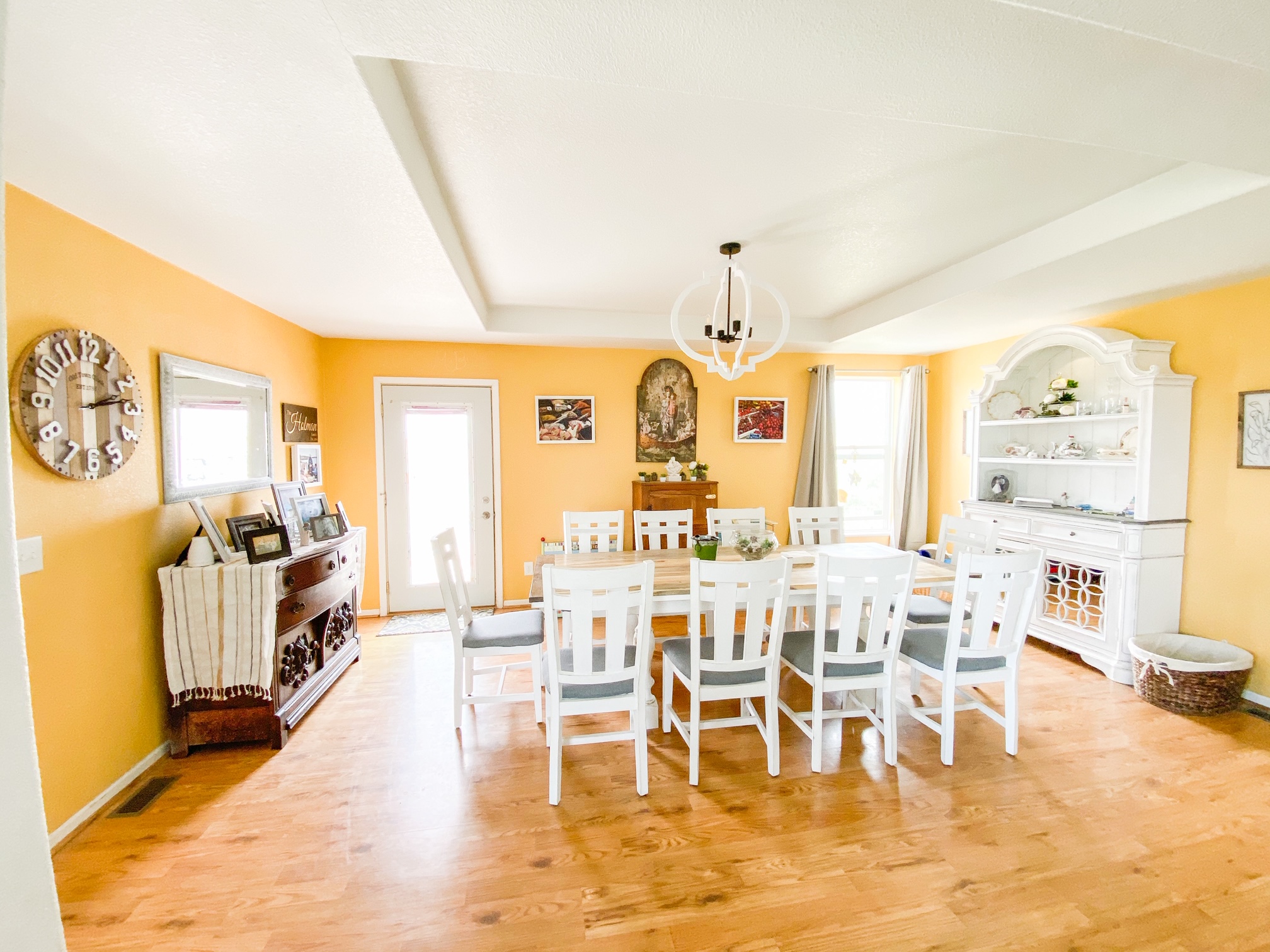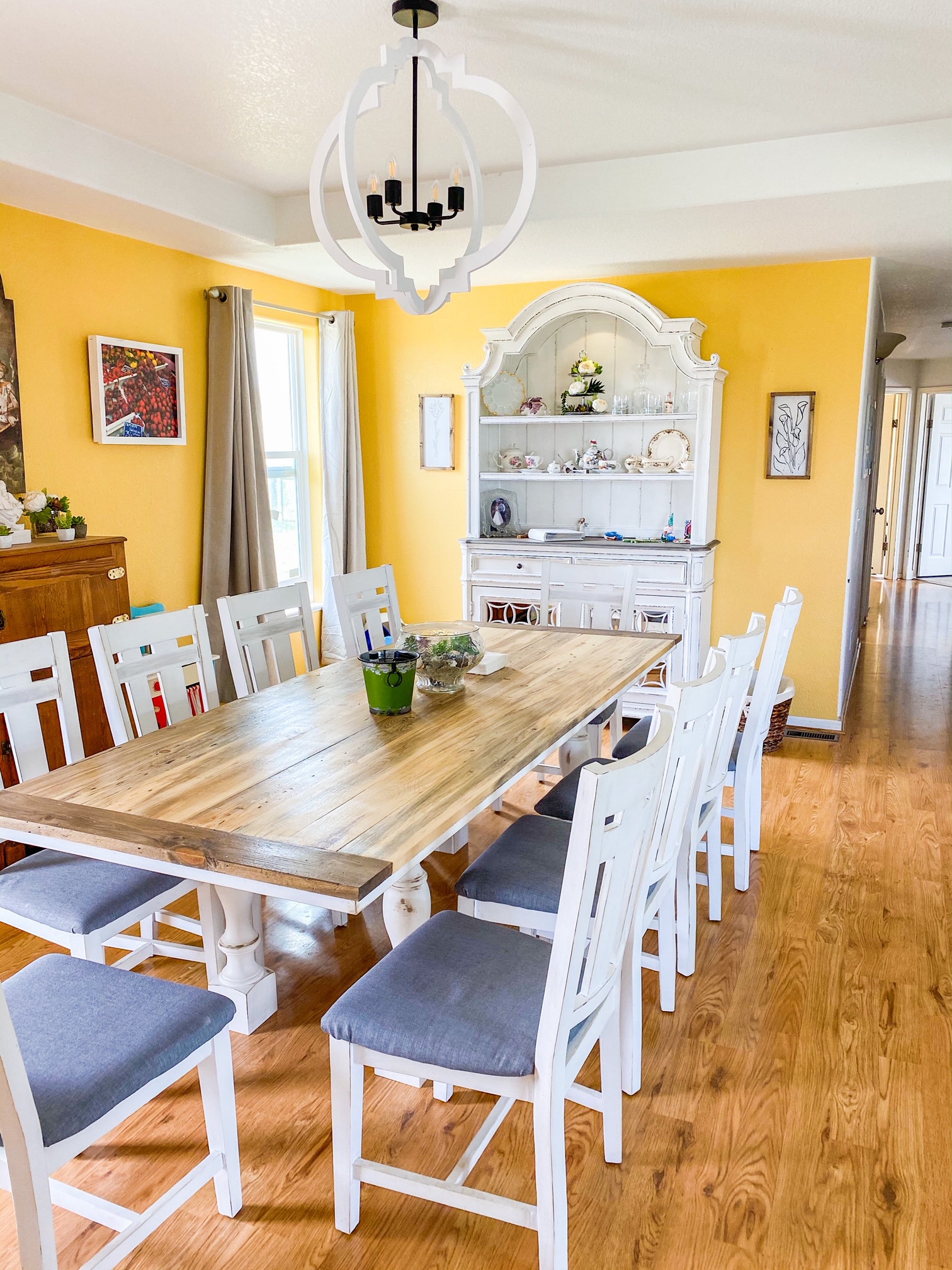 - This hutch was the biggest investment in this renovation, but well worth it. The curved details tie it in with the large painting and the chandelier, and the rustic feel and white color ties in with the table and kitchen cabinets. The paintings on the left and right were custom made by a local artist to match the decor.