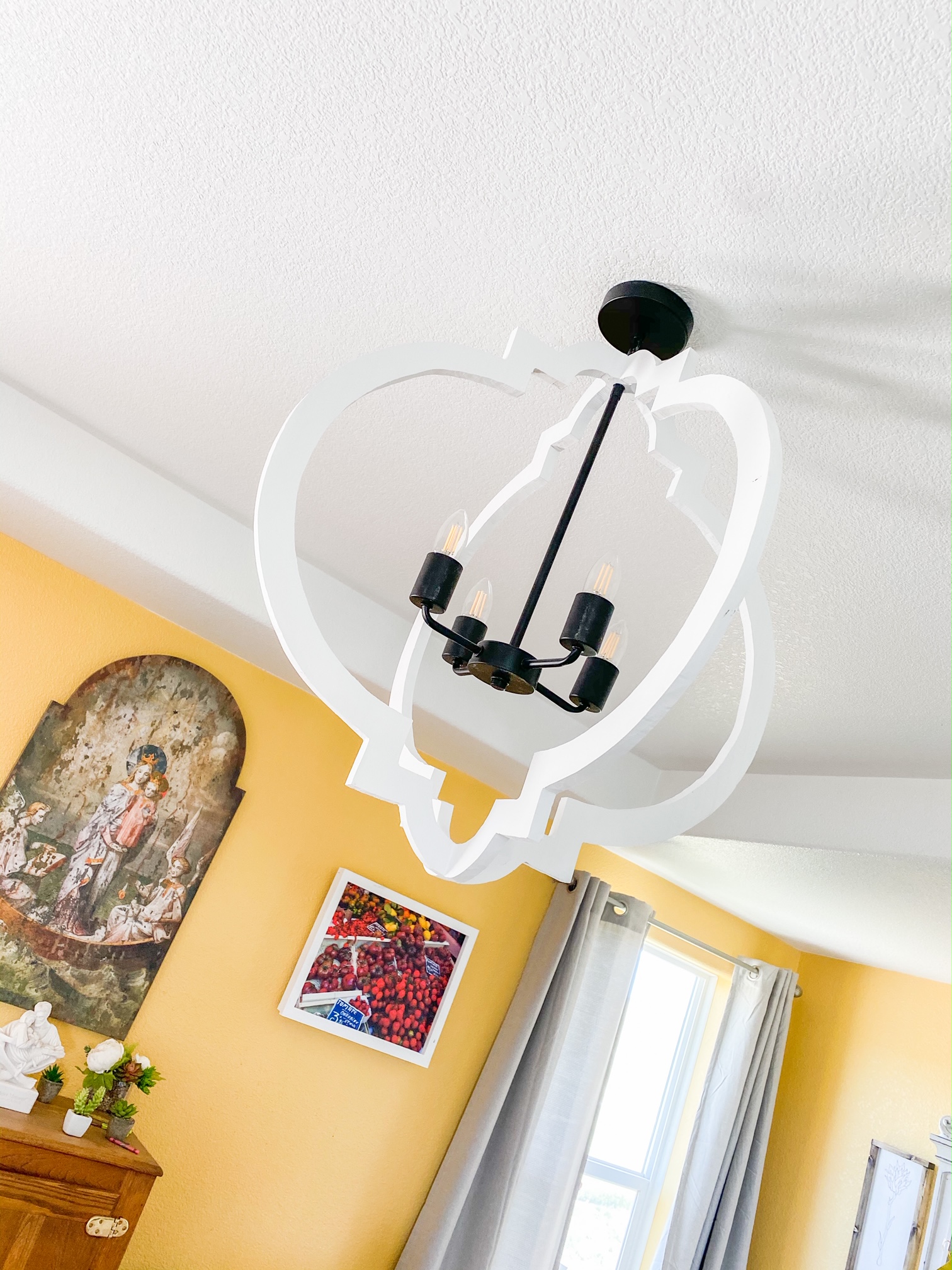 - This chandelier was designed by me, and created by The Cowboy. I wanted to tie it into the shape of the arch of the painting behind it. It was also important to me to have something light and airy rather than industrial and heavy.