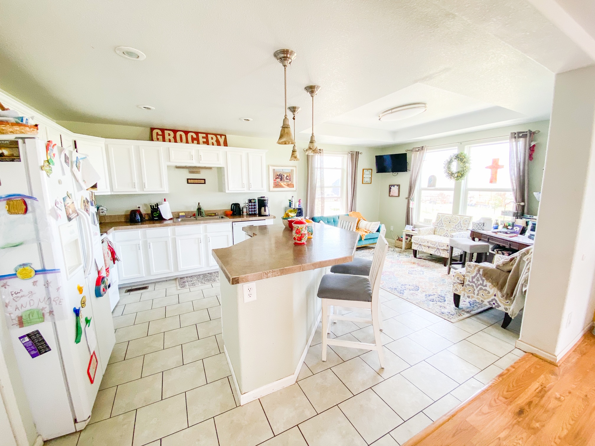 - Two years ago we painted the kitchen cupboards white. No regrets lol. We also added the window behind the couch a few years ago to allow for more sunlight.