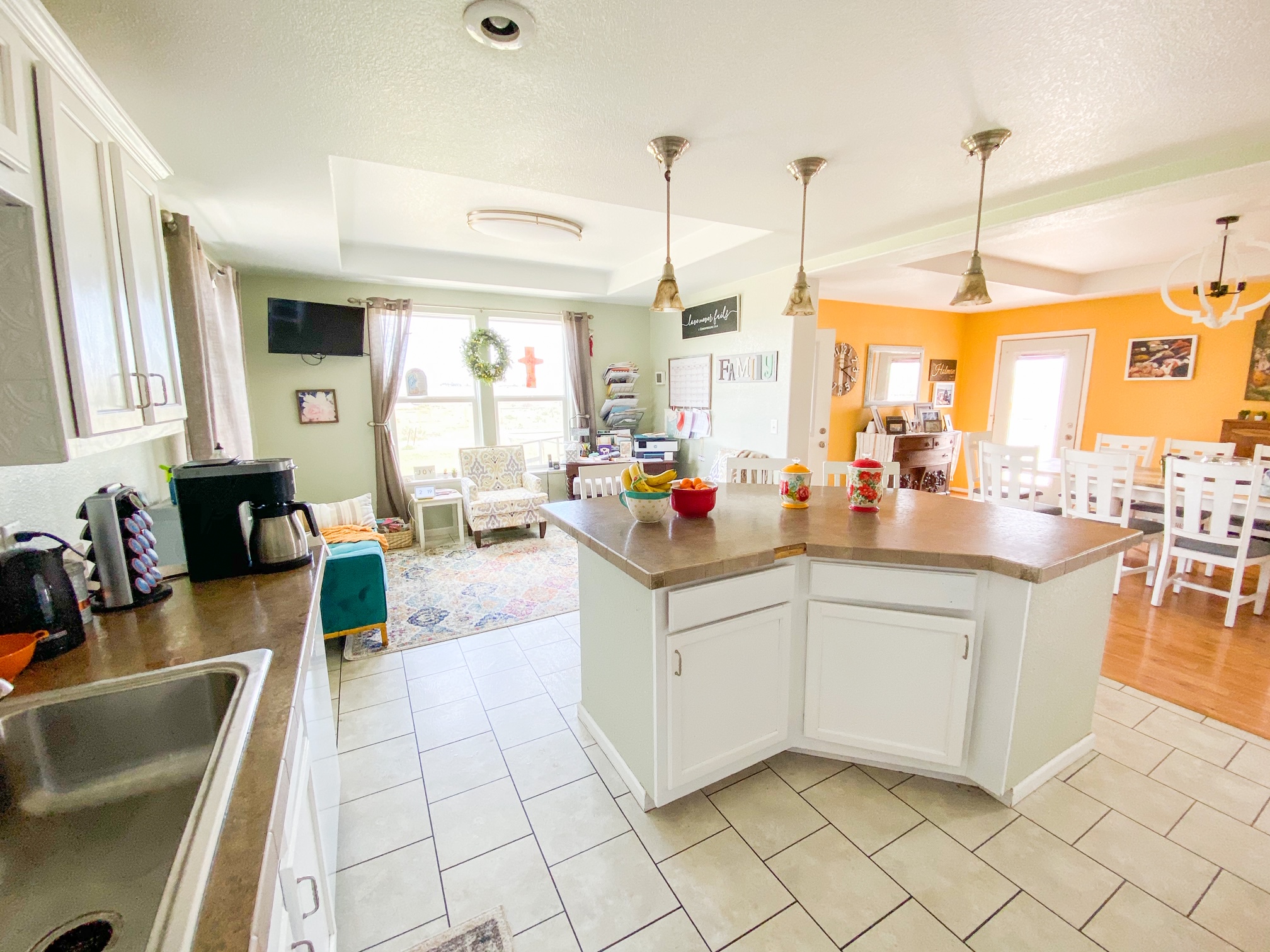 - Here is the view standing in the corner of the kitchen. This is an open concept that combines the kitchen, seating area and dining room. The seating area and dining room are meant to be the opposite way from what we have, but as our family grew we had to make some changes.