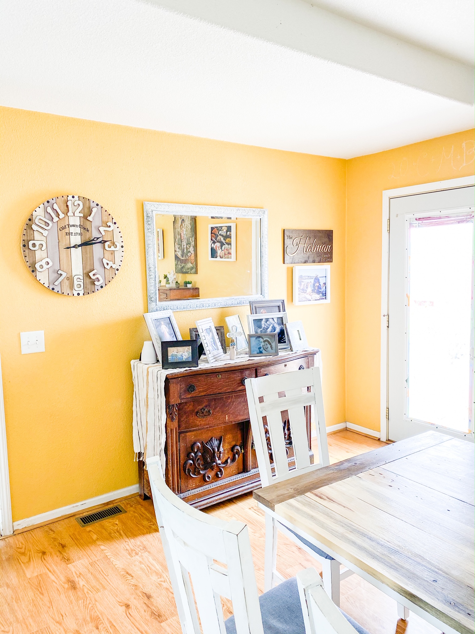 - This room is one of my favorites, I love the golden yellow walls. The new white furniture makes it more open and I added some details to help our heirloom furniture blend in.