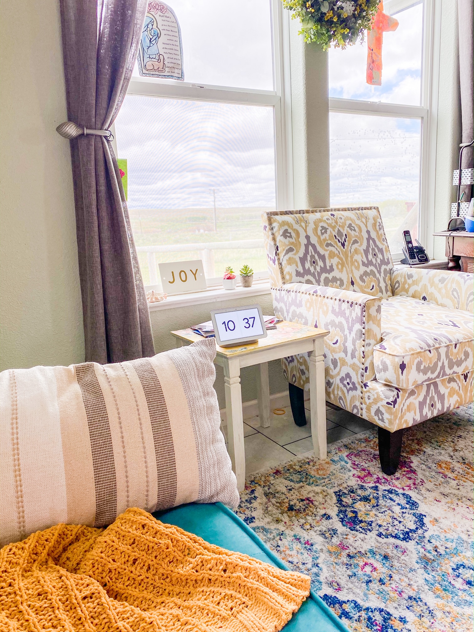 - Bohemian Chic Vintage Distressed Area Rug: This rug ties in all the colors from all three rooms, and already has a purposefully faded look so it works perfectly for a home with 5 kids (and 2 dogs and cats).